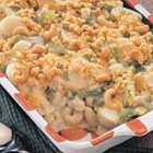 - In a greased 13-in. x 9-in. x 2-in. baking dish, layer the first seven ingredients in the order listed. In a bowl, combine the soups, milk and broth. Pour over water chestnuts. Cover and refrigerate overnight. Toss butter and cracker crumbs; sprinkle over casserole. Top with cashews.